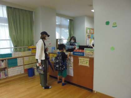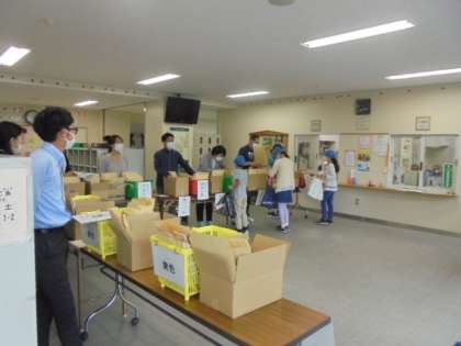 18日(月)午前9時から第2回目の学習課題を配布しました。今回は、第1回目の課題を集めるため、机の形をL字にしました。昇降口では教員が課題を渡しながら、保護者の方や子どもたちと話をすることができました。図書室も開室しており、本の返却をしたり借りたりする姿がありました。