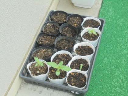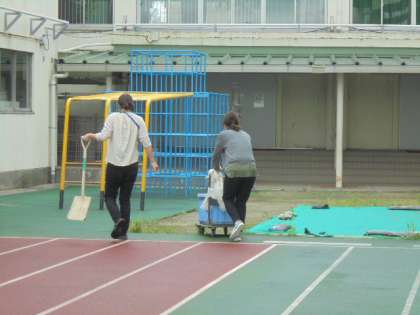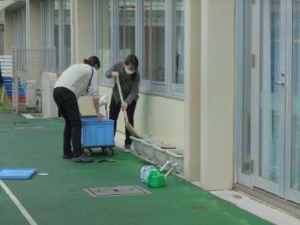 第1回目の課題回収後、担任の先生たちはプリントの丸付けや自学ノートを見ています。その間、副担任の先生やすまいるの先生たちは、各学年のお手伝いをしています。中庭では、3年生の理科の学習準備をする先生たちがいました。プランターに土を入れて2種類の野菜の種をまきました。2種類の野菜にモンシロチョウをよぼうとしています。さて、その野菜の名前は何でしょうか。3枚目の写真は、ヒマワリとホウセンカの様子です。