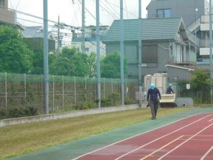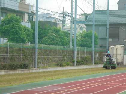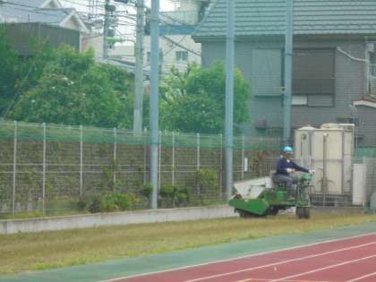 27日(水)の午前中、校庭の一角にある芝生の手入れ作業がありました。草刈りは主事さんたちが行いました。今回は、業者の方に手入れをしていただきました。