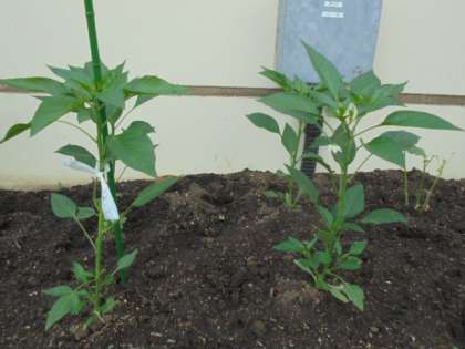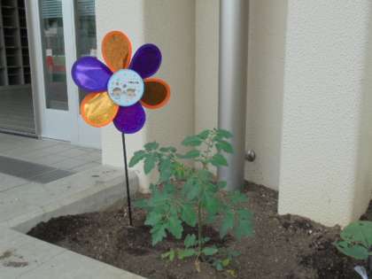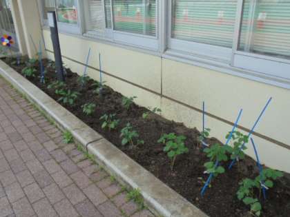 昇降口わきの畑では、2年生が植えた野菜が元気に育っています。伸びてきたので、先生たちが支柱で倒れないようにしました。かわいい花を咲かせたものもあります。