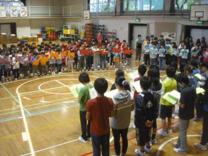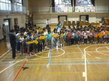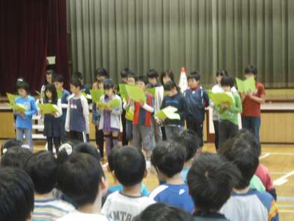 詩の朝会が行われました。今日は、6年生が中心となって、1〜5年生とともに一緒に詩を味わいました。心がなごむひとときでした。