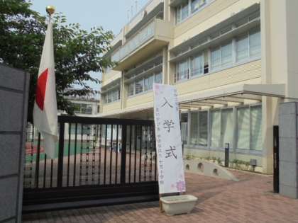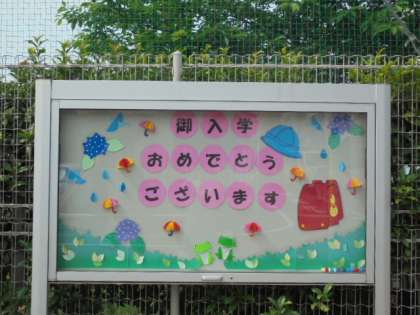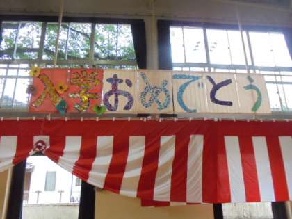 入学式を彩ったものの紹介です。立て看板、外の掲示板、体育館ギャラリーの「入学おめでとう」です。