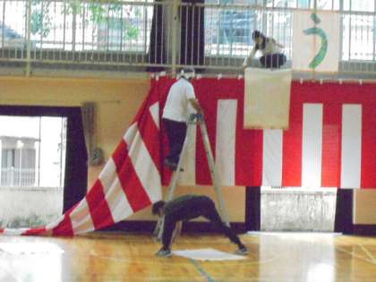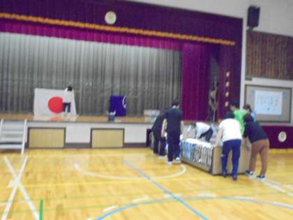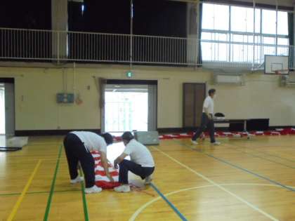 6日(土)、入学式終了後に会場の片付けをしました。最初に、パイプいすや2年生のいす等の消毒をしました。その後、紅白幕を外したり、いすを運んだりしました。