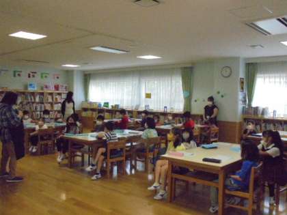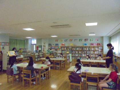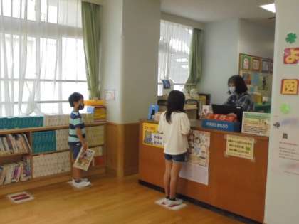 8日(月)、2年生、3年生、5年生は図書室の利用の仕方を学びました。司書の先生から説明があり、その後借りたい本を探しました。手続きをする際は、足跡マークにそって待つことができました。