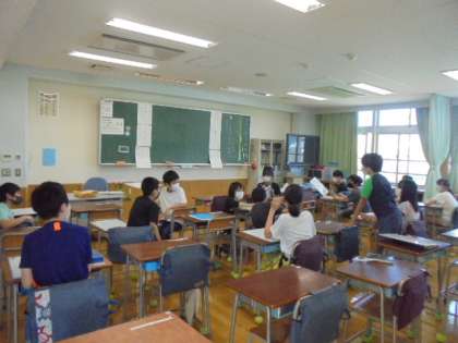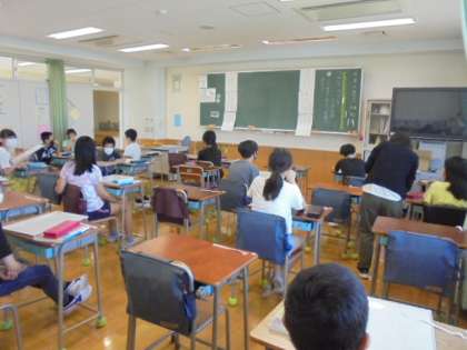 6年生は、国語の時間に、友達と文章作りを行う「つないで つないで」に挑戦しました。各自にホワイトボードとペンが渡されました。最初と最後が決まっている文章の中身を順番を決めて考えました。最後の文章につながるように、真剣に考えていました。