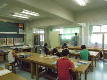 4年生は、今学期最初の図画工作の学習をしました。「みるひとが たのしくなるような はな」をテーマに、花の絵を描きました。クレパスやカラーペン、色えんぴつなどを使い、重ね塗りをするなどして自分のおもうはなを描いていました。