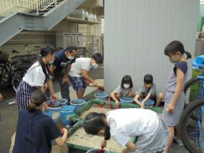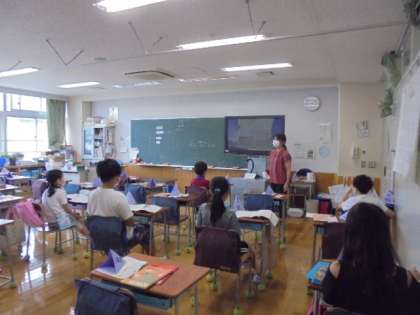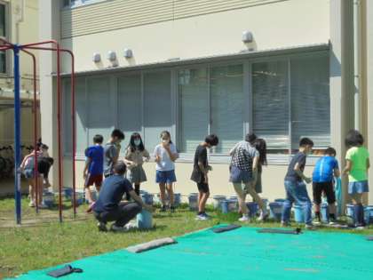 5年生は、今学期最初の音楽の学習をしました。日本の音階について、調べたことをまとめました。また、総合の学習として「バケツ稲」に挑戦しました。一人1個のバケツに土と水を入れて混ぜ、そこに種を植えました。バケツは、中校庭の保健室前に運びました。