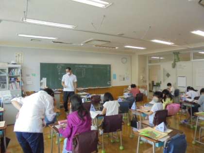 5年生の国語は、漢字の学習から始まりました。子どもたちは、先生が出す漢字の問題にすぐに答えることができました。算数は、体積の求め方について考えました。少人数算数の先生も一緒に授業に参加しました。