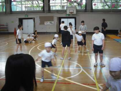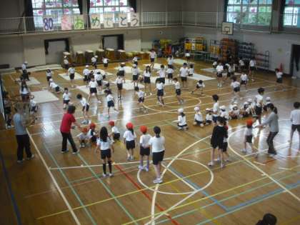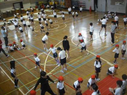 今日の1時間目は、5,6年生がお手伝いをしながら、1,2年生の反復横とび、上体起こしを行いました。