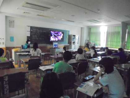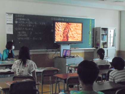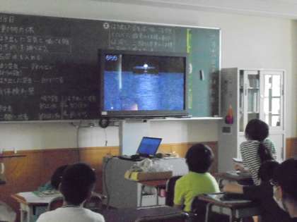 6年生は教室で理科の学習をしていました。単元名は「人や動物の体」です。今回は、吐き出した空気と吸い込む空気の違いを調べていました。映像を見ながら、自分の体にも備わっている仕組みに驚いていました。