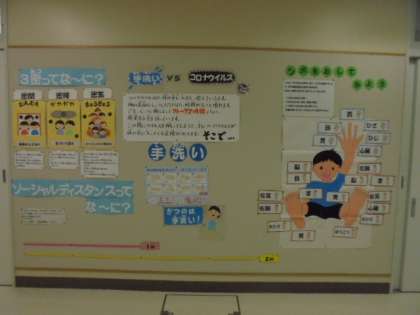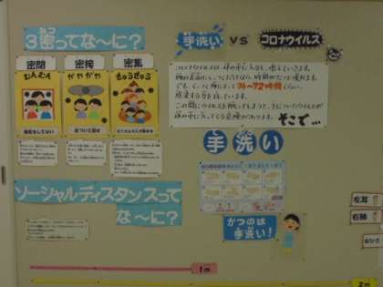 保健室前の壁に、コロナウィルス対策に役立つ掲示物が登場しました。3密のこと、ソーシャルディスタンスのことなどを詳しく紹介しています。子どもたちも足をとめて見ています。