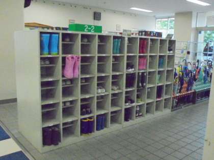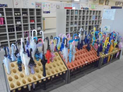 靴箱と傘立の様子です。分散登校ですから、半数の人数ですが、靴の入れ方や傘の立て方がきちんとできています。こういうところにも、中里小の子どもたちの良さが表れています。