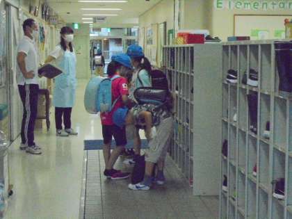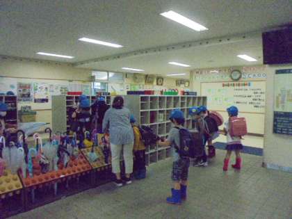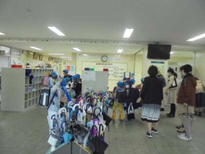 22日(月)より一斉登校が始まりました。あいにくの雨となりましたが、子どもたちは元気に登校しました。昇降口では、傘を束ねたり、レインコートを脱いだりしながら、教室に向かう準備をしました。