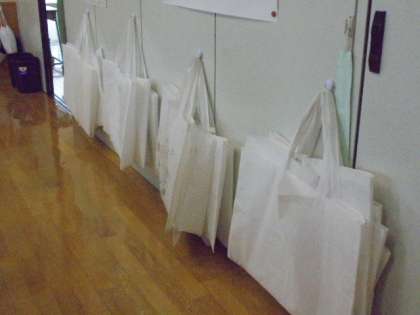 本校では、給食時に使用している衝立を不織布袋に入れて保管しています。不織布袋は、昨年度図画工作の作品持ち帰り用に準備したものです。