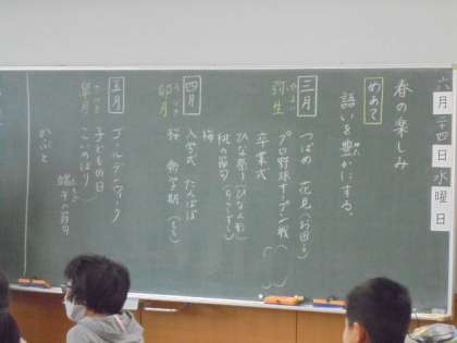 24日(水)の3時間目、4年2組は国語の時間でした。季節のことばから「春の楽しみ」をみんなで考えました。語彙を豊かにすることがねらいです。最後は、連想ゲームをして、みんなで言葉をつなぎました。