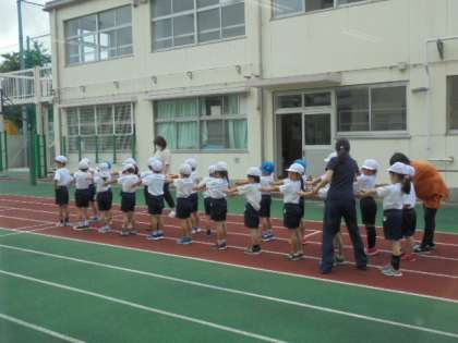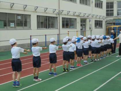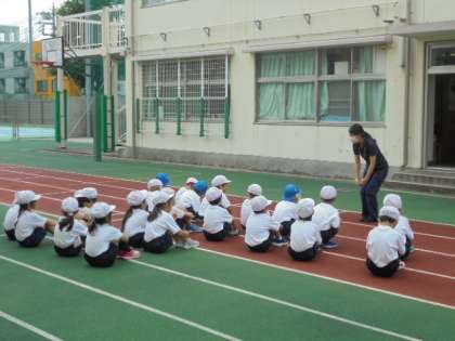 24日(水)の4時間目、1年1組は体育の時間でした。中校庭で、整列の仕方を練習しました。2列に並ぶ、向きを変えて並ぶ、4列に並ぶ、体育座りをするなど、徐々に慣れていきました。