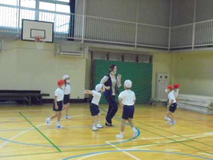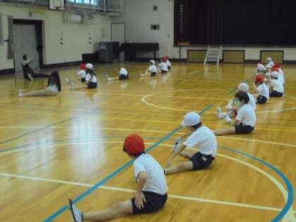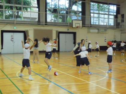 25日(木)の2時間目、2年1組は体育の時間でした。体育館で、初めての学習でした。最初に、先生の笛の合図で並ぶ練習をしました。すぐに並べるように、先生の近くを歩く子どもたちが何人もいました。その後、ストレッチをしてから、2人組で体を使ったじゃんけんをしたり、手裏剣ごっこをしたりしました。