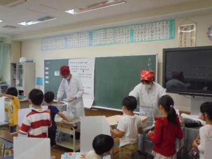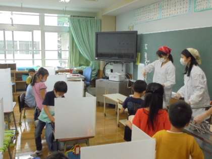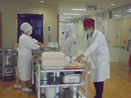 25日(木)の給食の様子です。給食室から運ばれたワゴンが、各階のホールに並びます。ワゴンを教室に運ぶのは、担任です。身支度をして取りに行きます。その際に、アレルギー対応の食事があれば、確認の上サインをします。今回は、初めて汁物が登場しました。先生たちが配膳し、子どもたちはしっかり受け取って席につくことができました。写真は1年生の様子です。