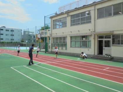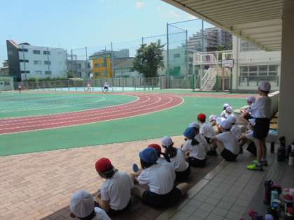 29日(月)の4時間目、4年生は合同で体育を行いました。準備運動ののち、走るための話を聞いたり、スタートの確認をしたりしました。その後、4人ずつ50mを走って記録をとりました。暑さも増してきたため、玄関前のミストシャワーの下で順番を待ちました。