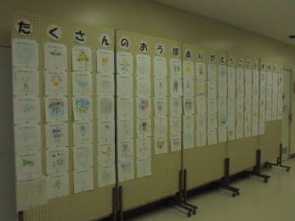 30日(火)の給食の時間、運営委員による発表がありました。90周年記念キャラクターとスローガンが決定したという内容です。臨時休業中に子どもたちから募集し、先週投票を行って決定しました。職員室前の廊下には、応募してくれた全作品が展示されています。