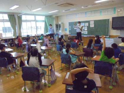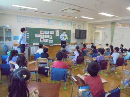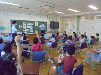 2日(木)の1時間目、1年2組は外国語の時間でした。担任とALTとで授業を進めました。「はらぺこあおむし」の絵本を英語バージョンで読んでもらいました。子どもたちは、ALTの質問に「わかった」と言って手を挙げていました。