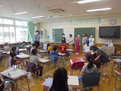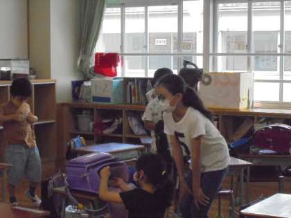 8日(水)の朝、6年生が1年生の教室を訪ね、朝の準備を見守りました。写真は1年2組の様子です。目線を合わせるために腰を屈める姿がありました。