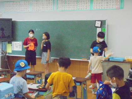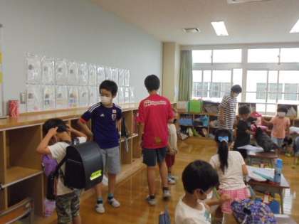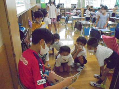 8日(水)、1年1組の朝の様子です。6年生が1年生の姿をやさしく見守っています。支度が整った1年生に本の読み聞かせをしていました。