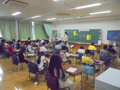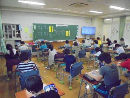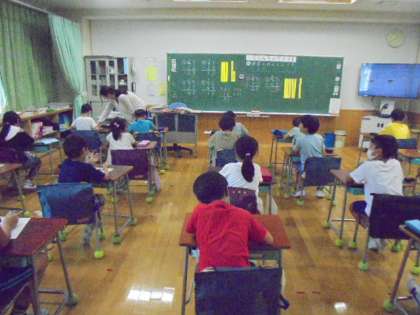 2年1組は算数の時間でした。「ひっ算の練習をしよう」と題して、計算問題を次々に解いていました。先生から○をもらうととても喜んでいました。