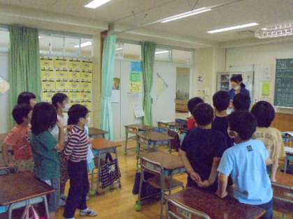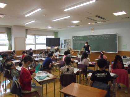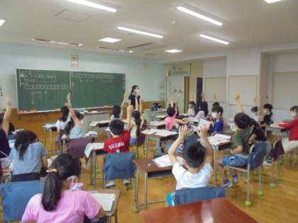 3年生は算数の時間でした。わり算の学習に入り、「何袋に分けられるか、説明しましょう」を課題として取り組みました。12÷4=3になることを絵で表したり、友達とグループを作ったりすることで理解しました。