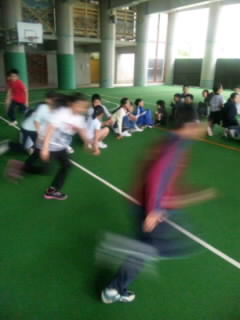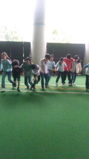 お風呂の前に屋根付き広場で集団ハンカチ落とし、二人三脚で楽しく汗をかきました。