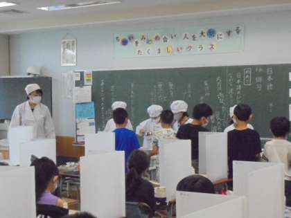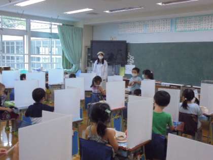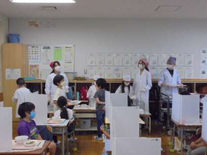 9日(木)の給食の様子です。子どもたちは間隔をあけた準備や片付けに慣れてきています。写真は上から、1年生、2年生、4年生の様子です。