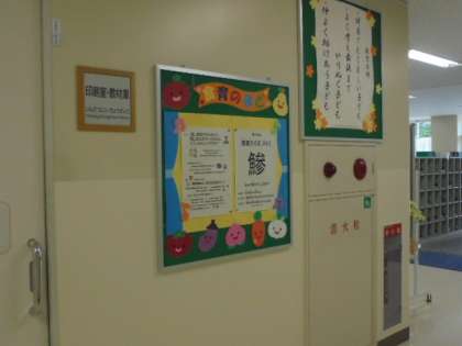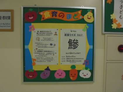 10日(金)、1階印刷室前に「食育のまど」が誕生しました。栄養士、事務アシスタント、スクールサポートスタッフの手によるものです。食べ物に対する意識を高めてほしいとの願いからです。子どもたちは「かわいい」と言って見ています。また、給食室入口には、その日の献立や食材産地等を紹介するコーナーもあります。保護者の皆様もご来校の際にご覧ください。