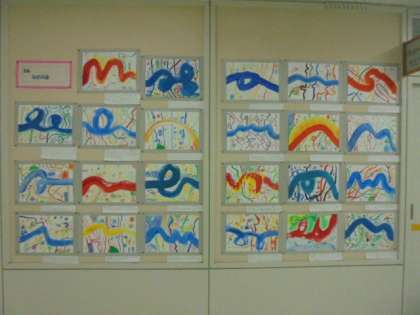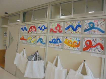 3年生の廊下には、図画工作の時間に取り組んだ「なぞの道」の作品が掲示されています。画用紙の中央に色鮮やかな道があり、目を引きます。作品紹介文も一生懸命に書きました。