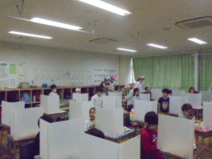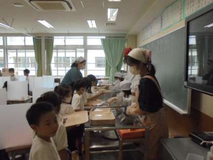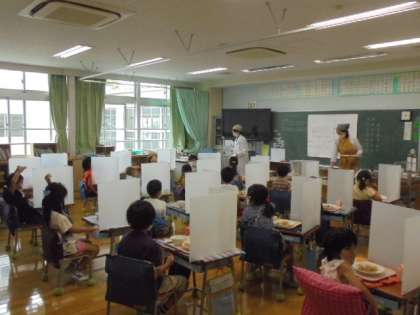 13日(月)の給食の様子です。給食も4週目に入りました。写真は上から、1年1組、1年2組、2年1組です。