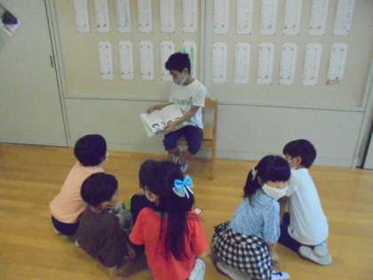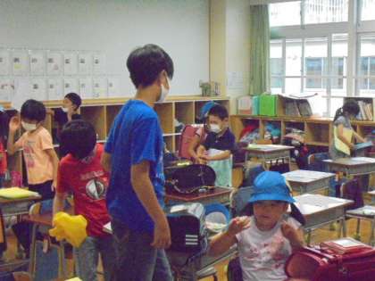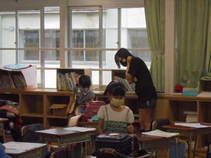 14日(火)、1年1組の朝の様子です。1年生は自分で自分のことができるようになっています。6年生はそっと見守っています。ランドセル等の片付けが終わった人から、廊下で6年生の読んでくれる本を静かに聞いていました。