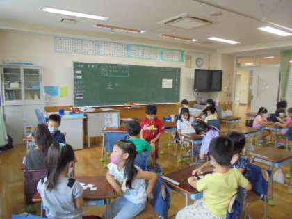16日(木)の2時間目、1年2組は算数の時間でした。「いくつといくつで9になるかを考えよう」をめあてに、2人組でカードを使いながら考えました。