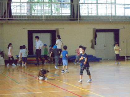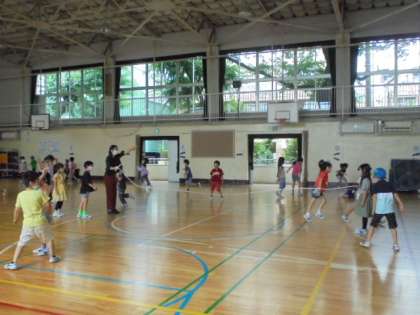 中休みの体育館の様子です。木曜日は、1年生の割り当てでした。担任の先生、すまいるの先生と一緒に、長なわとびをしたり、鬼ごっこをしたりしました。