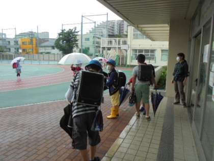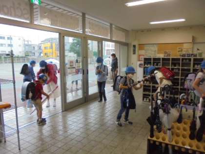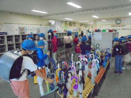 17日(金)の登校の様子です。傘を閉じて束ねるときに、両手が濡れてしまう子がいます。できるだけ手を濡らさずに束ねるにはどうしたらよいのでしょう。傘を使った日は指先の訓練に役立ちます。