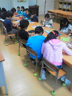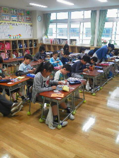 来週の砧公園への全校なかよしタイムの打ち合わせを各班ごとに行いました。班の数字を基にしたデザインを6年生が考え、全員が同じデザインのワッペンをつくりました。
