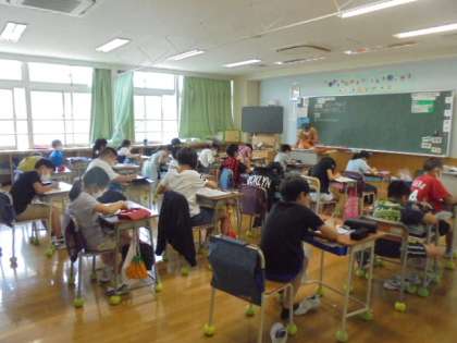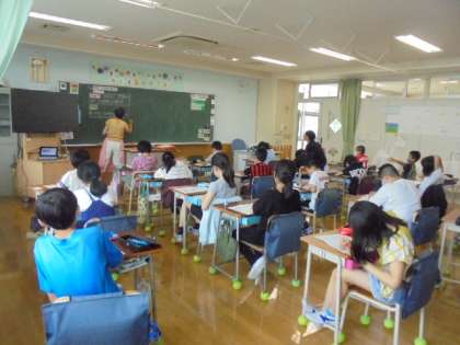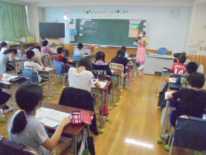 20日(月)の3・4時間目、4年2組は理科の時間でした。前回から、2組だけ講師の先生による授業が始まっています。今回は、「暑くなると生き物の様子はどうなるだろうか」の予想を立てていました。子どもたちは、「あたたかくなると」で学習したことを思い出しながら、考えました。