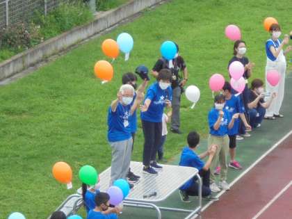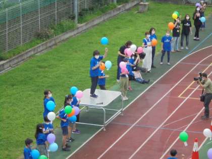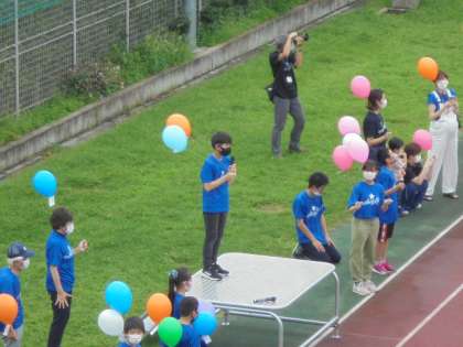 バルーンリリース集会は、6月の分散登校以来、初めて全校児童がそろった集会です。運営委員の司会のもと、校長先生のお話、代表児童の言葉と続きました。校長先生より、周年実行委員長さんの紹介があり、いよいよカウントダウンの時を迎えます。