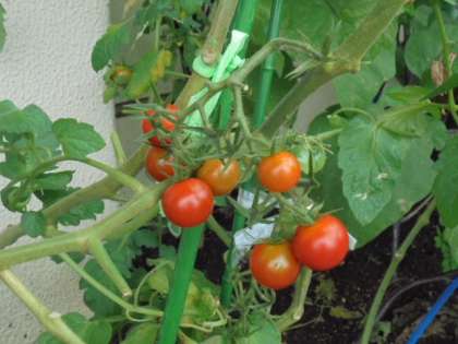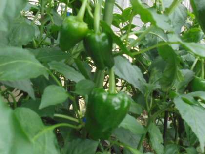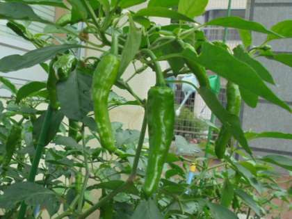 2年生が育てている野菜の様子です。上からピーマン、ミニトマト、ししとうです。緑黄色野菜の色とつやがとてもいいです。