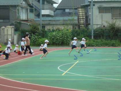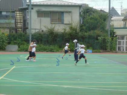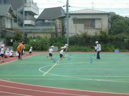 27日(月)の3時間目、1年1組は体育の時間でした。校庭で、ミニハードルを飛び越して走る練習をしました。飛び越したあと、三角コーンを回って元の位置に帰ってきました。
