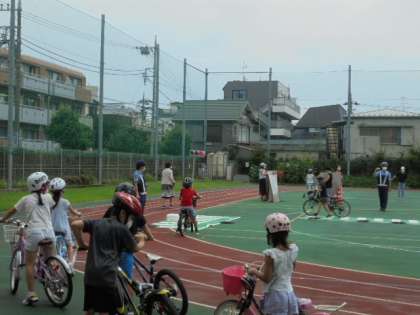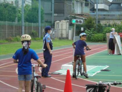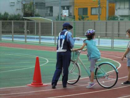 警察官のお話と手本を見せていただいたあと、いよいよ子どもたちが自転車に乗りました。ヘルメットをかぶり、「右、左、右後ろ」を確認してからペダルをこぎ出しました。今回も、PTA校外委員の皆様、保護者の皆様のご協力をいただきました。ありがとうございました。