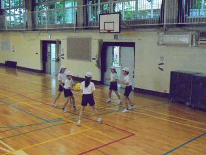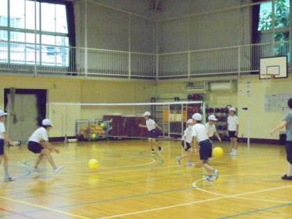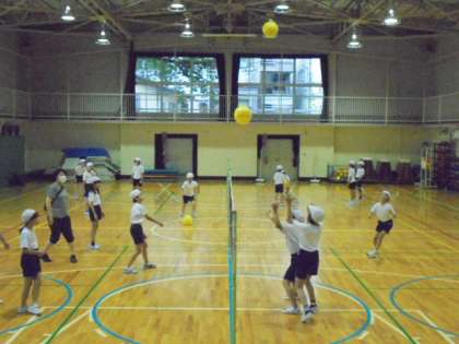 29日(水)の2時間目、4年2組は体育の時間でした。体育館で「ソフトバレーボール」に取り組んでいました。4〜5人でチームを作り、ボールを落とさないように打ち返す練習をしました。