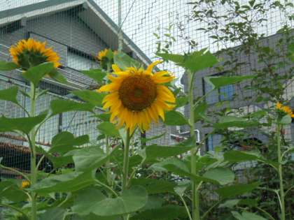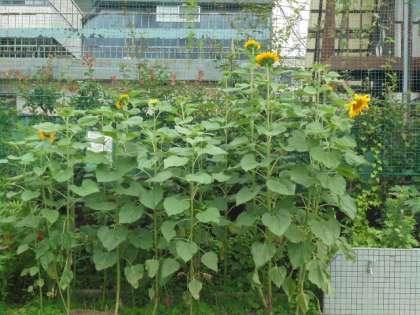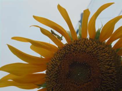 3年生が学年の畑で育てているヒマワリが花を咲かせました。近づいて見てみると、小さなカマキリがいました。