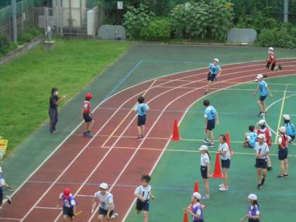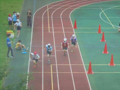 30日(木)の2時間目、6年生は体育の時間でした。校庭で「リレー」に取り組んでいました。4チームに分かれ、走順を決めたり、バトンパスの練習をしたりしました。その後、リレーを2回行いました。1回目が終わると水分補給をしながら、振り返りを行ったり、再度バトンパスの練習をしたりしていました。写真は、2回目のリレーの様子です。