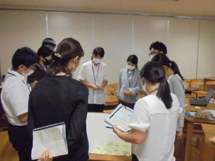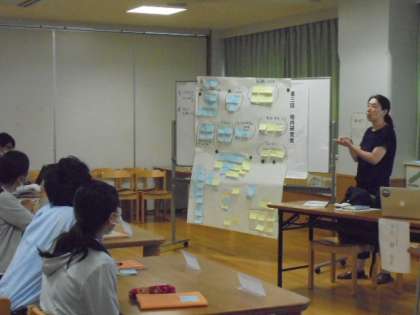 校内研修は、講師の先生にご来校いただき、「イエナプラン教育」について基本理念、特徴的な学習形態等のお話を伺いました。途中、グループを作って疑問点を出し合いました。午後は、2色の付箋紙を使って、リフレクションを行いました。