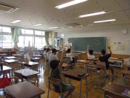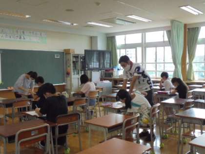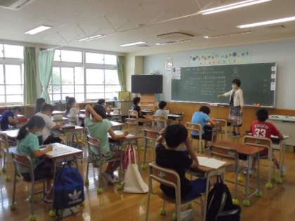 午前9時15分になると学習は終わりです。振り返りカードに記入してから片付けをします。チャイムは鳴りませんが、子どもたちは「さようなら」「また明日」とあいさつをして昇降口に向かいます。写真は、4年2組、5年1組、6年1組です。