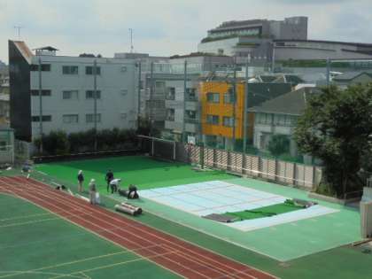 4日(火)、校庭に設置してあるプールに人工芝がかけられました。フェンスを外すことから始まり、約6時間かけての作業でした。